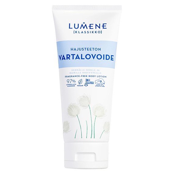 Hajusteeton Lumene Klassikko -vartalovoide sopii herkälle iholle ja kaikille ihotyypeille. Voide jättää ihon sileän ja kosteutetun tuntuiseksi. Vartalovoiteen koostumus sisältää ainutlaatuisen yhdistelmän hoitavaa pohjoista tupasvillaa sekä puhdasta pohjoista lähdevettä.