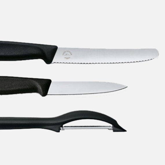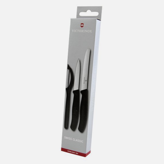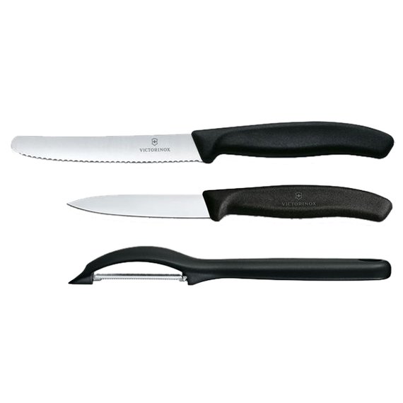 Pieniä fiksuja veitsiä ei voi koskaan olla liikaa. Victorinoxin käytännöllisessä kuorimasetissä on tomaattiveitsi, kuorimaveitsi ja kuorija. Kaikki veitset soveltuvat loistavasti kuorimiseen ja pieneen pilkkomiseen. Sahalaitainen tomaattiveitsi puree kovaankin kuoreen, kuorijalla poistat kuoren hetkessä kokonaan, ja kuorimaveitsellä poistat helposti hedelmien ja vihannesten kannat. Veitsissä on pitävät polypropyleenikahvat.