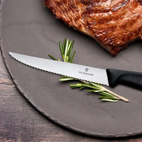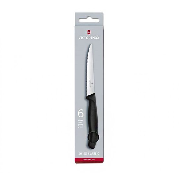 Kunnon pihviateriaa ei kannata pilata kehnoilla veitsillä. Hanki hyvän pihvin seuraksi laadukkaat Victorinoxin pihviveitset. Lahjapakkauksessa on kuusi teräväkärkistä, ruostumattomasta teräksestä valmistettua pihviveistä. Veitsissä on liukumaton kahvamateriaali ja muotoiltu kädensija. Terän pituus 11 cm.